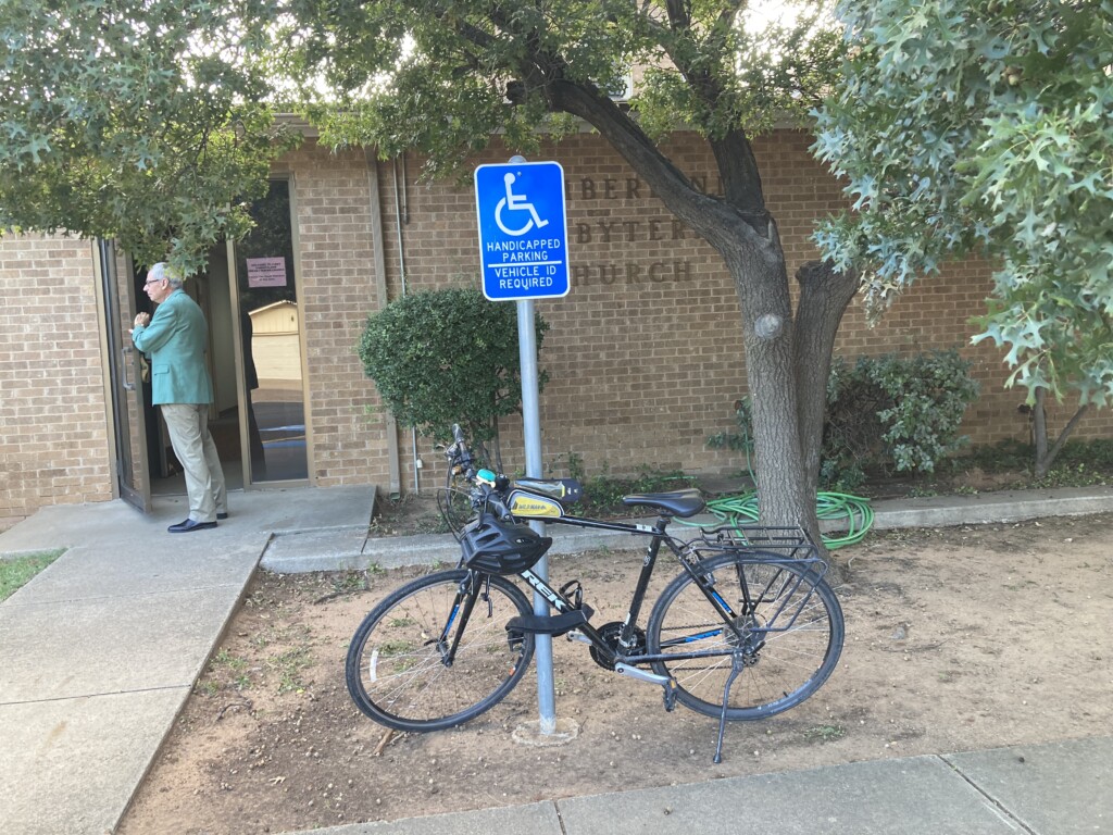 We have a different perspective on the city’s quirks: where a motorist ought to have eyes only for the road and its occupants, our slower pace and requisite extra vigilance means we might find amusements in the easily missable. “WATERING DONE BY PRIVATE WELL” proclaims a lawn sign at the Seventh-Day Adventist center on my way to church—lest neighbors be tempted to jealousy over the green pastures down the street when water bans are in effect, presumably. I know the intersections most frequently strewn with shattered glass (a typical college town hazard) and those whose sensors can’t detect a cyclist for the light change. I know which particularly obnoxious one has a “protected left turn on green” that means every fresh red light is twice as long as it ought to be. I know the inordinate relief afforded by a four-inch strip of white demarcating a five-foot-wide strip of relatively safe—if extraordinarily rare—bike lane. I know it takes 20 minutes to wheel my bike down the stretch of my church route with neither bike lane nor sidewalk with cut curbs.