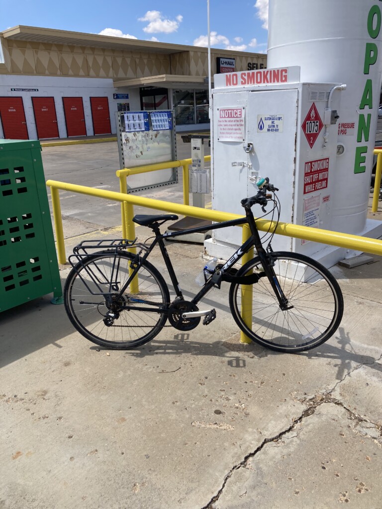 “Please don’t take your bike in here,” the guy behind the counter at U-Haul requested. “There aren’t any bike racks,” I pointed out. “Yeah,” he said, with the unspoken “so what?” following me out the door. I cast around for a convenient substitute, then locked my only means of transport to the enormous propane tank enclosure. I’ve snugged my bike up to grocery cart pens, handicap parking signs, trees, and railings—provided they don’t have a peevish warning that bikes locked there will be confiscated.
