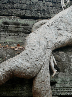 We visited the ancient temple complexes at Angkor Wat and Angkor Thom, where the Khmer empire of the 10th, 11th, and 12th centuries centered their rule. We heard about the constant back and forth in that time between Hinduism and Buddhism: one king dedicated his temple to Vishnu and the next to Buddha or the compassionate bodhisattva Lokeshvara. Our guide told us he never goes to these temples to pray because prayer is something to do in silence, not something to do to show off. And then he showed us a tree root that looks like a butt.