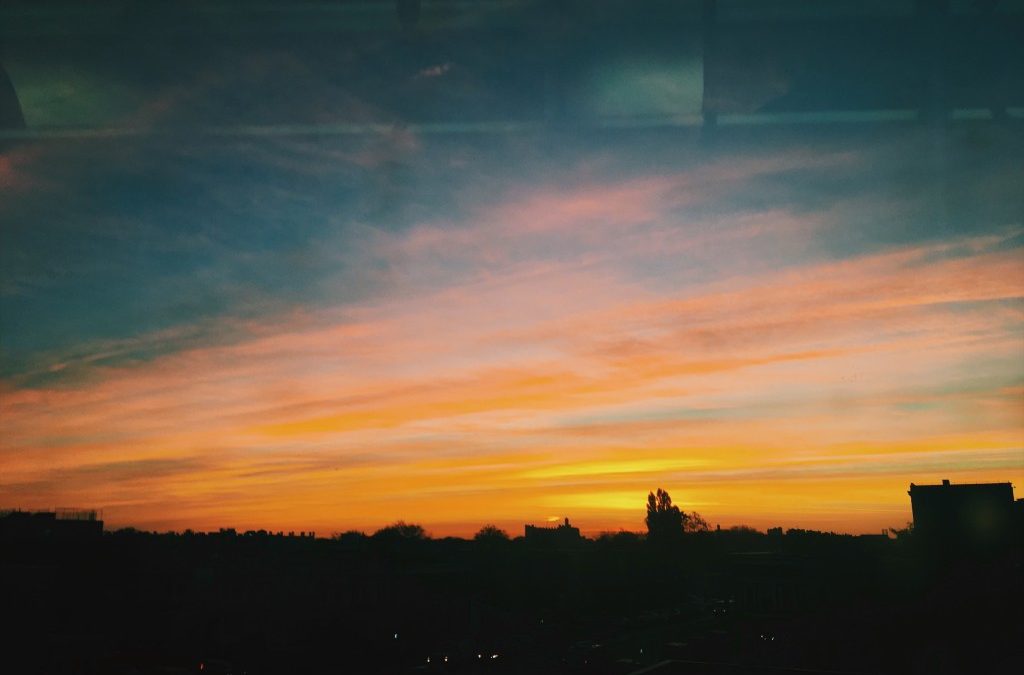 Now that the winter is approaching and daylight saving has not yet begun, I exit the train before the sunrise but after first light. Although I cannot see the sun, it is already lighting up the sky. Sometimes I pass stops where the light is performing beautifully for an audience who is unaware. Crowds of people stand with their backs to the colors, their eyes on their phones or on the train tracks. “Turn around!” I want to say, “You’re missing it.”